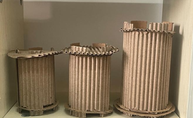 化工教研组的作品《一种用于多规格烧杯的瓦楞纸模块化保护装置》,巧妙地将标准化瓦楞纸与传统榫卯结构相结合,采用模块化凹凸设计实现对多规格烧杯的紧密包裹与固定,取代了传统单一规格的仪器保护包装。该作品融合了环保材质应用与自适应防护设计两大核心亮点。其精巧的结构创新、环保低成本的特性及高通用性优势在众多参赛作品中脱颖而出,最终荣获“科协主席奖”。