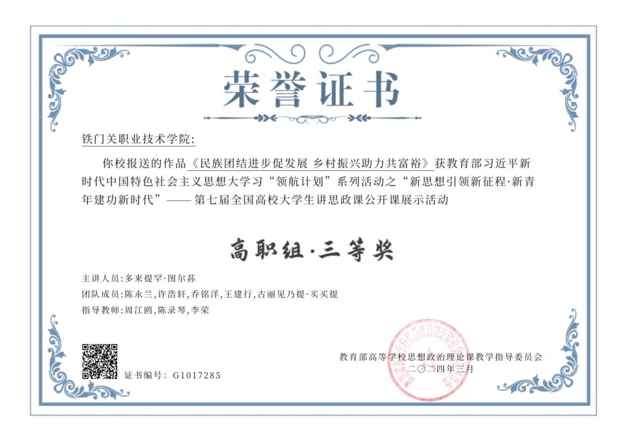近日,由教育部高等学校思想政治理论课教学指导委员会主办,南开大学马克思主义学院协办的“新思想引领新征程·新青年建功新时代”第七届全国高校大学生讲思政课公开课展示活动获奖作品名单公示,Beat365中文官方网站思想政治理论课教学部推荐报送的作品《民族团结进步促发展 乡村振兴助力共富裕》荣获全国高职组三等奖。