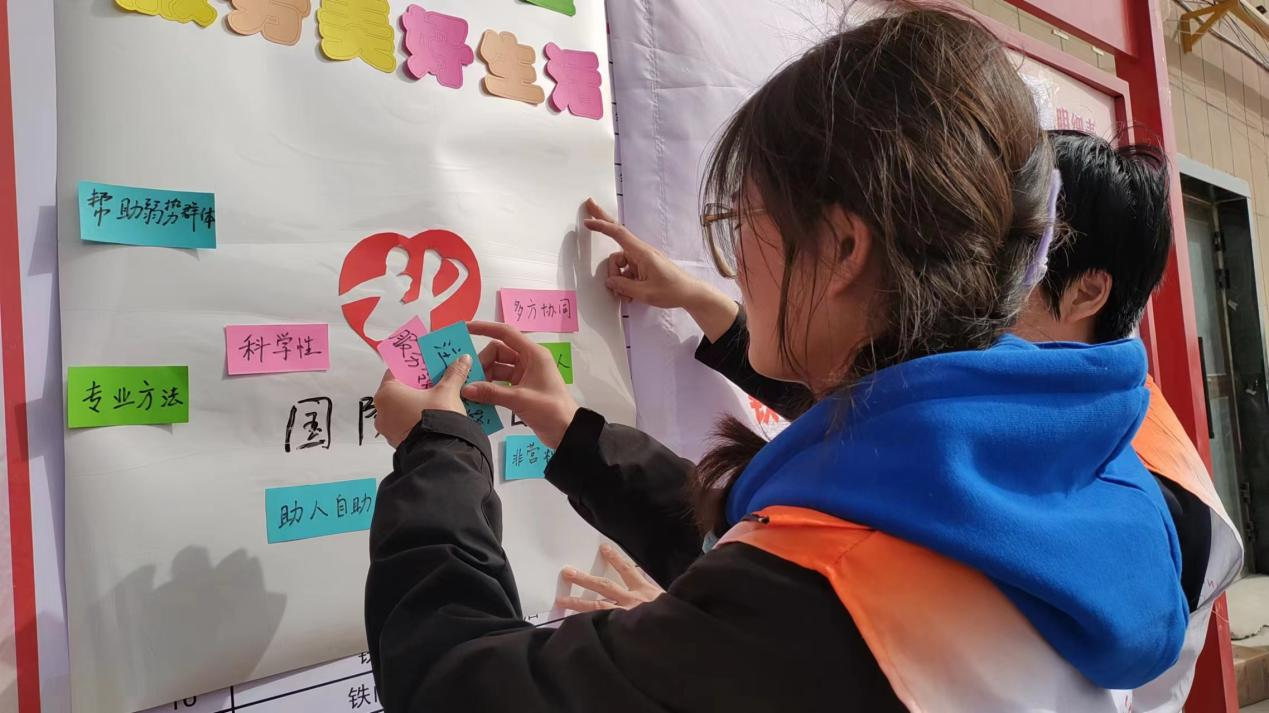 在活动现场,大学生志愿者与铁门关市西域社会工作发展中心工作人员一起摆放宣传展板、发放社工站宣传折页、社工服务内容及社工专业知识科普清单,展示社工站以往开展服务的内容与成果,同时向群众宣传社会工作的服务人群、领域、特色项目等。通过游戏互动环节,让居民们亲自动手写下心目中的社工“词条”,并贴在宣传海报上,让更多的人了解社会工作这一职业,扩大社会工作的影响力和认知度。