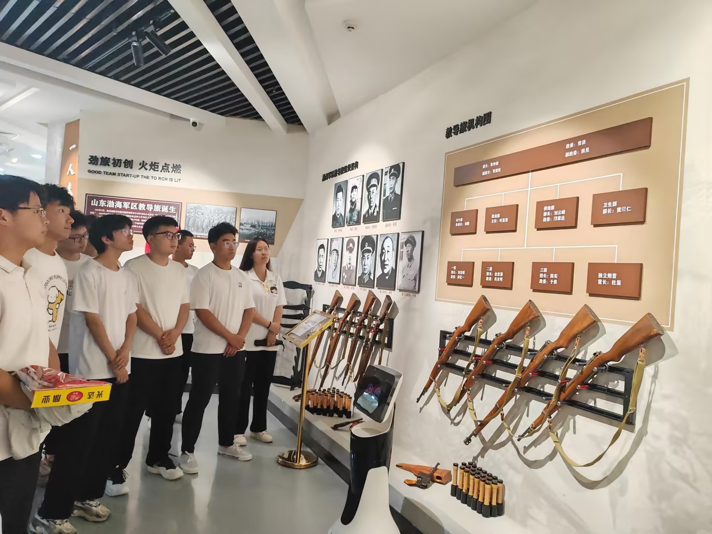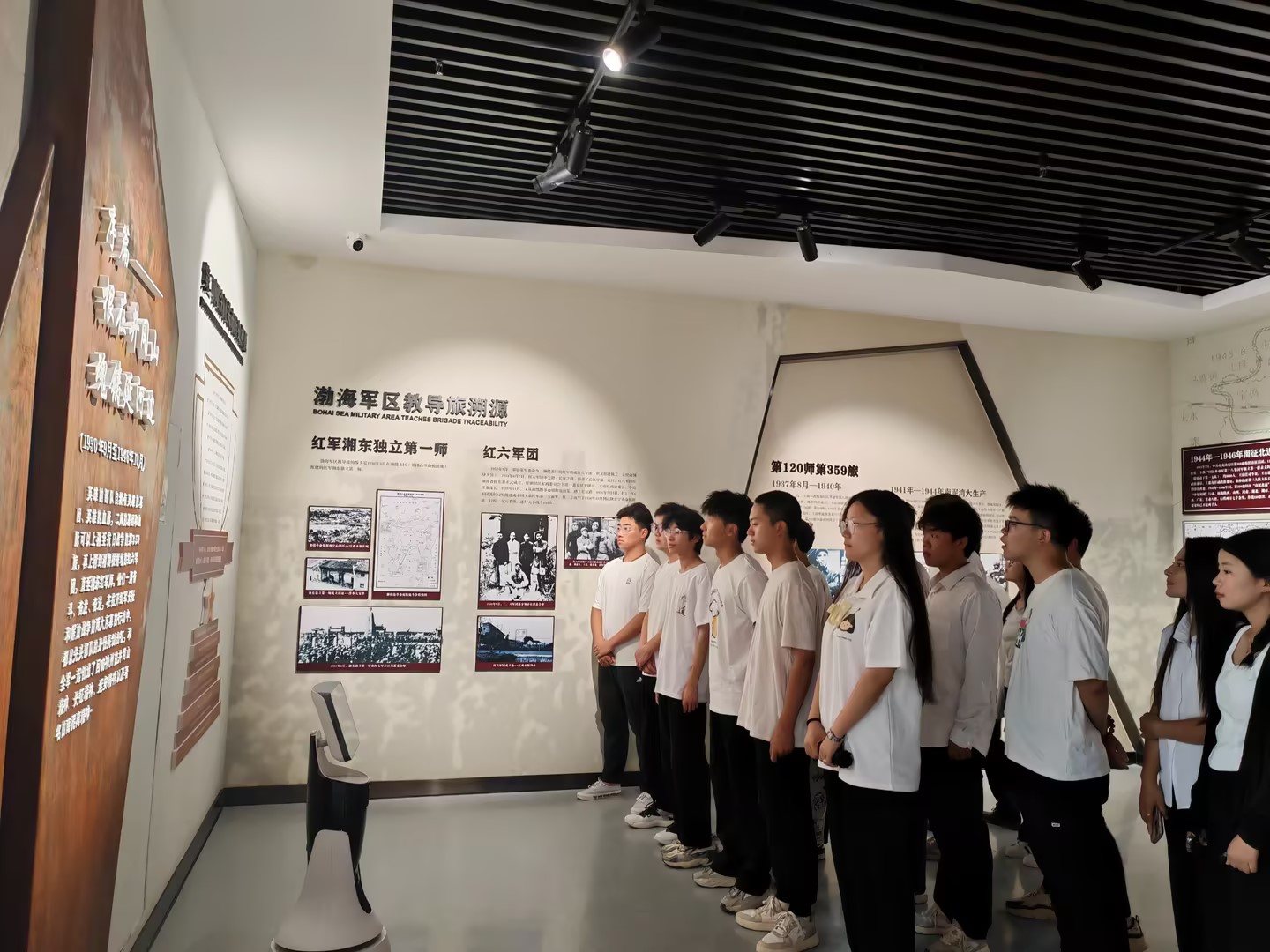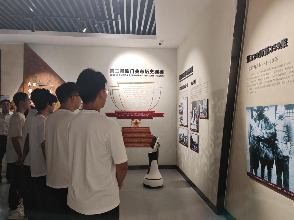 随后,在机器人的引导下,师生们共同走过了“根在井冈山,魂铸延河边”“星火宝塔山,建军渤海湾”“雷霆剑出鞘,浴血大西北”“军旗向天山,屯垦驻边关”“日月行天地,史册留英名”五个篇章。