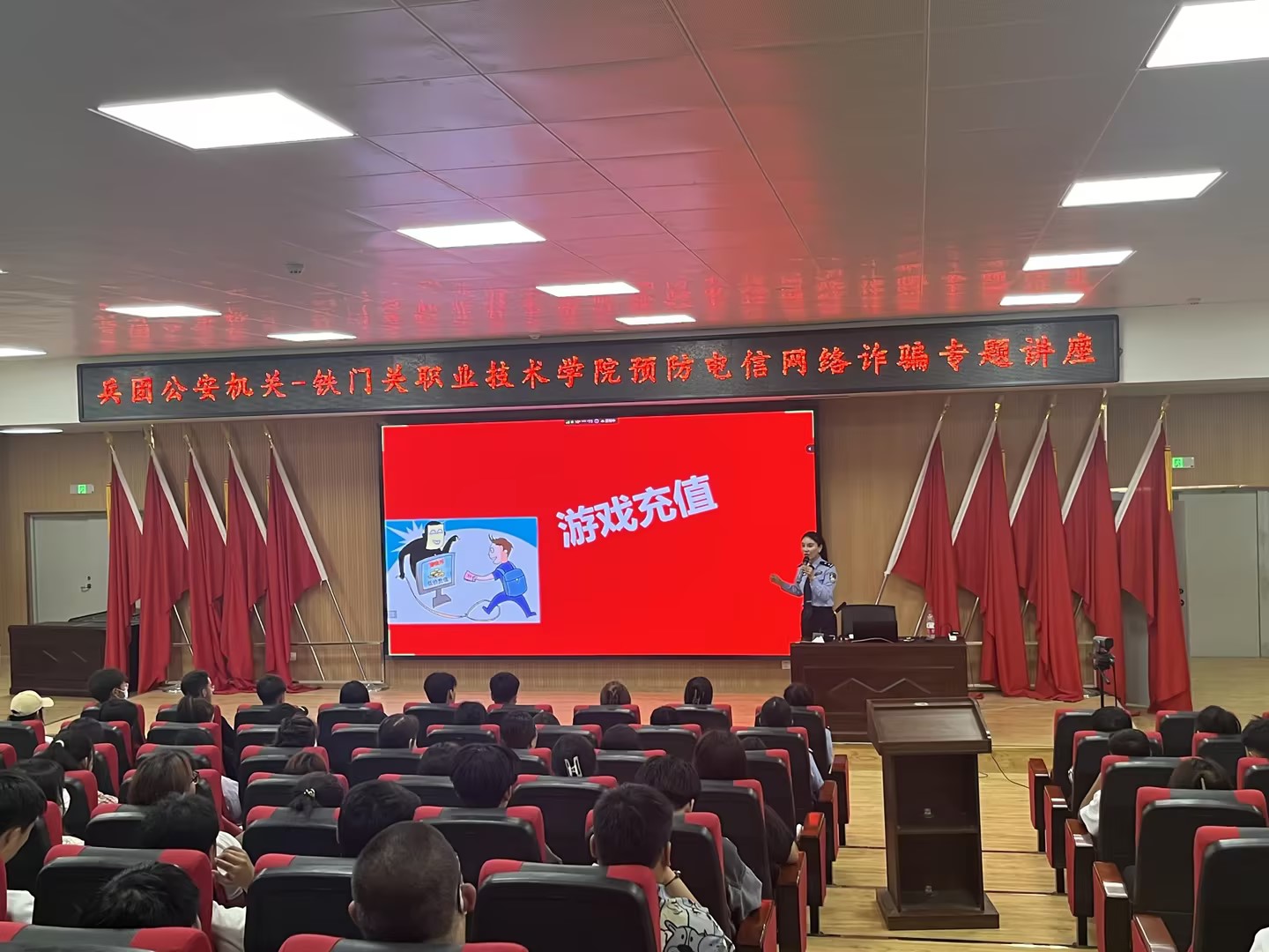 民警首先向老师和学生详细解读了当前多种电信诈骗犯罪的手段及预防措施,提醒广大师生在日常生活中提高安全防范意识,不要轻信中奖、“指导”汇款、涉及银行储蓄账号密码等情况的短信、电话、QQ信息等,更不要轻易汇款,如遇情况及时报警。
