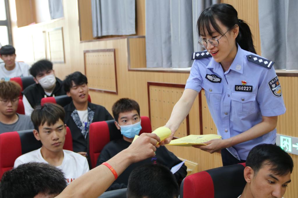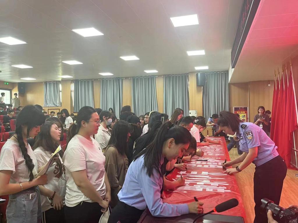 随后,民警将《防范电信诈骗宣传材料》发到学生手中,并组织各系学生代表依次在“预防电信诈骗从我做起”横幅上签下自己的名字,代表全体学生作出承诺。
