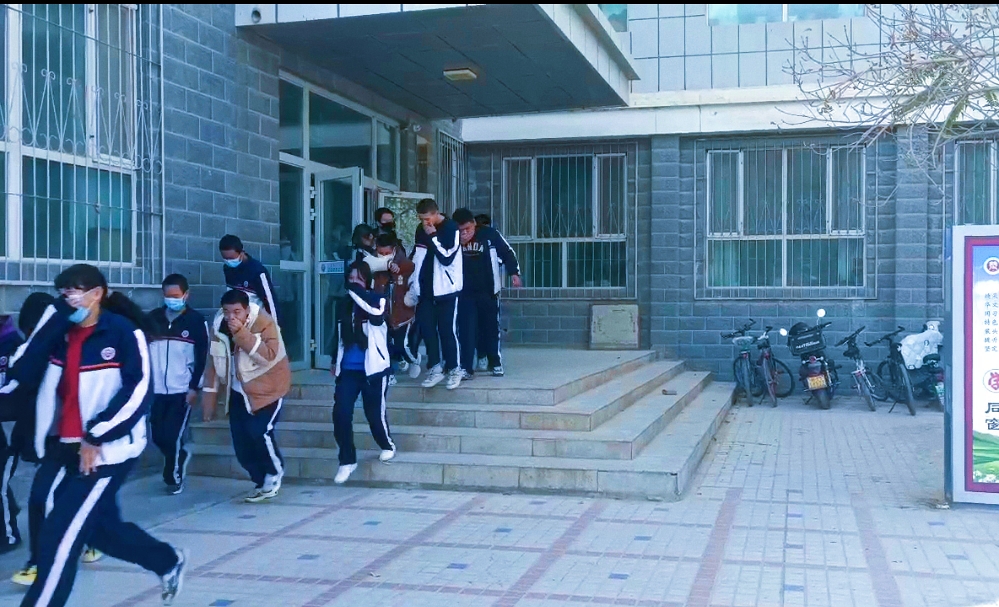 教学楼前,各班班主任迅速清点人数,层层上报,整个过程用时2分30秒,库尔勒校区1400余名师生全部安全撤离疏散完毕。