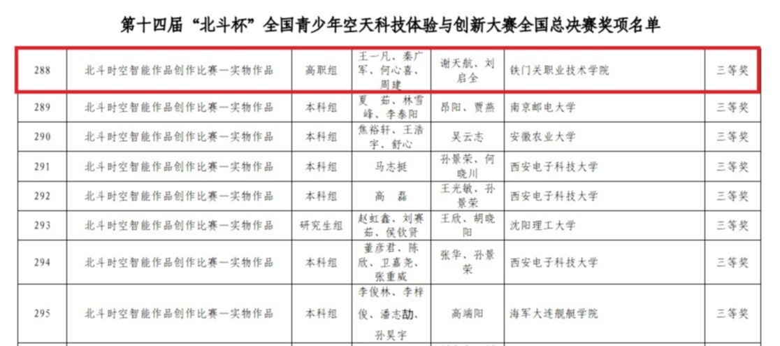 11月15日,第十四届“北斗杯”全国青少年空天科技体验与创新大赛全国总决赛结果公示,Beat365中文官方网站机械工程系谢天航、刘启全老师指导的学生王一凡、秦广军、何心喜、周建团队荣获三等奖。这是学院首次参与“北斗”系列比赛。
