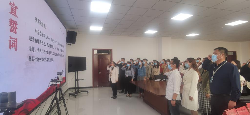 “我郑重承诺:牢记立德树人初心,践行为党育人、为国育才使命......”全体教师举起右拳庄严宣誓,更加坚定了立德树人初心,同时鞭策自己恪守承诺,全心全意培养德智体美劳全面发展的社会主义建设者和接班人。