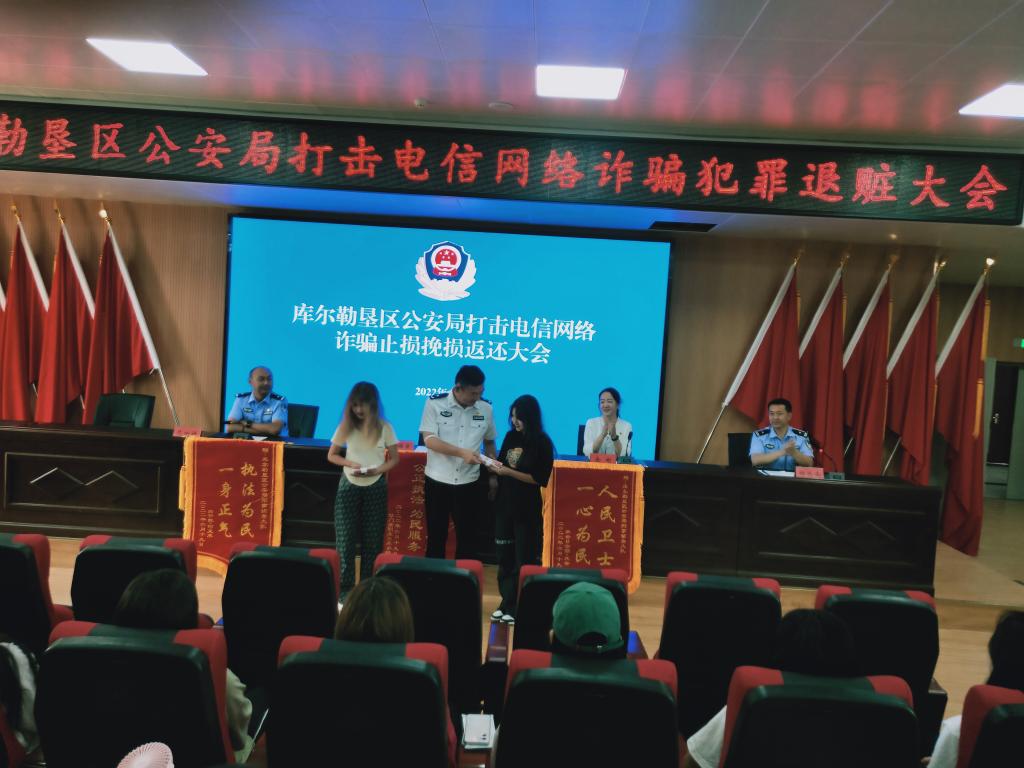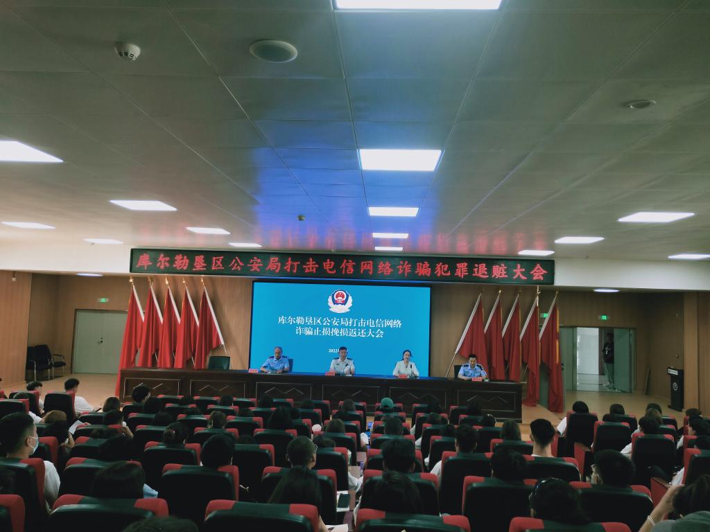 6月21日,Beat365中文官方网站联合库尔勒垦区公安局共同举办打击电信网络诈骗犯罪退赃大会,库尔勒垦区公安局领导、学院领导、学生代表共计200余人参加。
