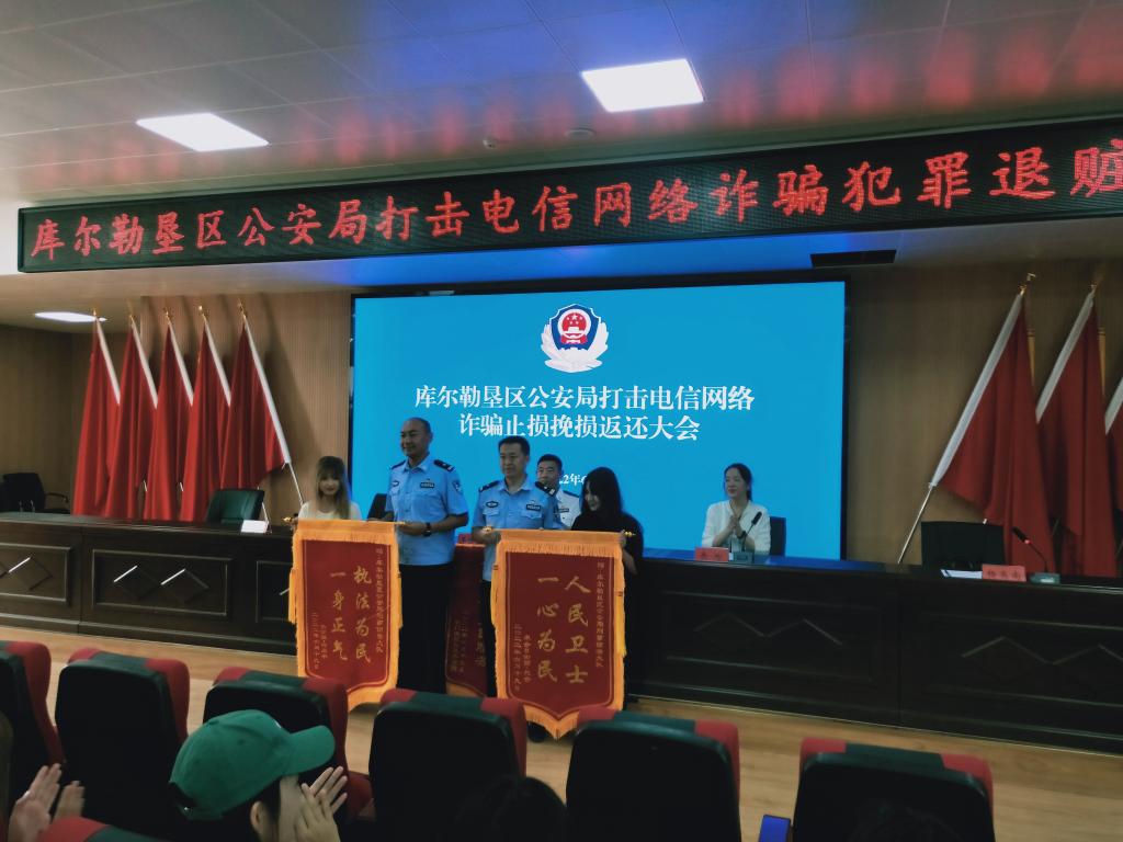 随后,学院代表、受害学生向库尔勒垦区公安局刑事侦查大队赠送锦旗。王保良书记向受害学生退还被诈骗钱款2万余元。