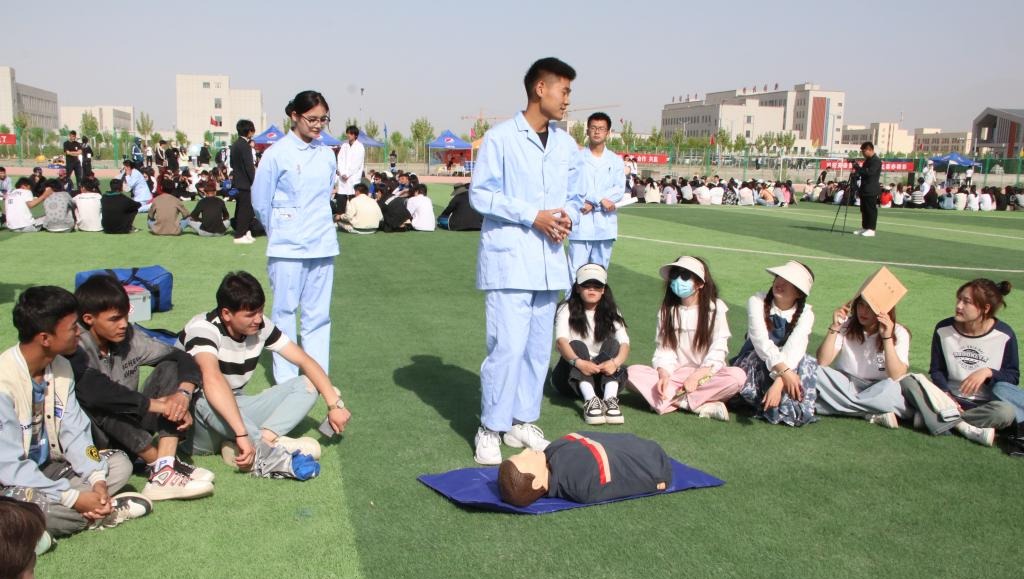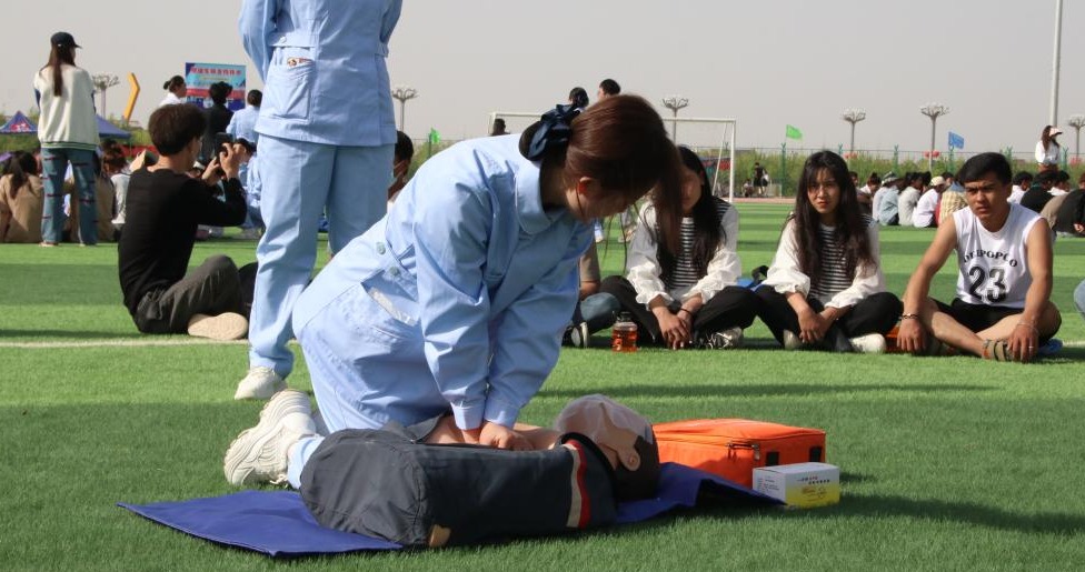 为普及应急救援医学知识,提高师生自救和他救能力,5月11日,Beat365中文官方网站邀请兵团兴新职业技术学院现代服务学院、基础生命支持技术公益培训团队来到学院运动会现场,为在场师生及运动员们进行应急救护知识培训。
