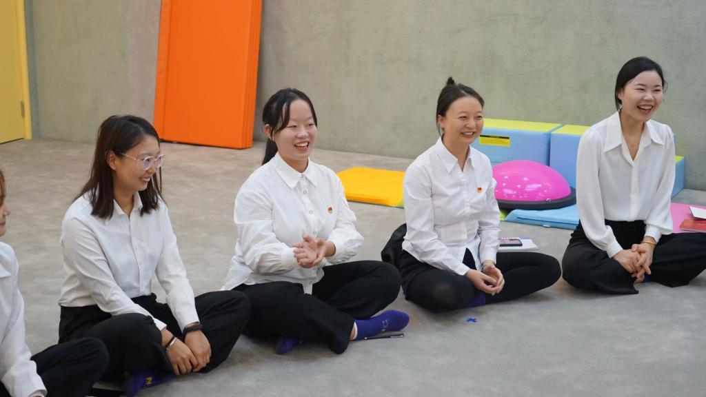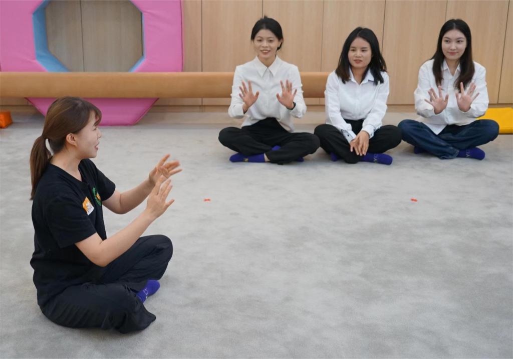 活动开始,早教中心负责人向该系部教师介绍机构早教课程模式,课程以培养婴幼儿全面发展为核心,设立了健身、音乐、艺术、厨艺等多元智能理论课程,助力婴幼儿成长。接着该中心教研主管带领老师们体验了一节早教课程,从热身到游戏活动,老师们一起认识教具、体验游戏、明确早教课程开展的过程。