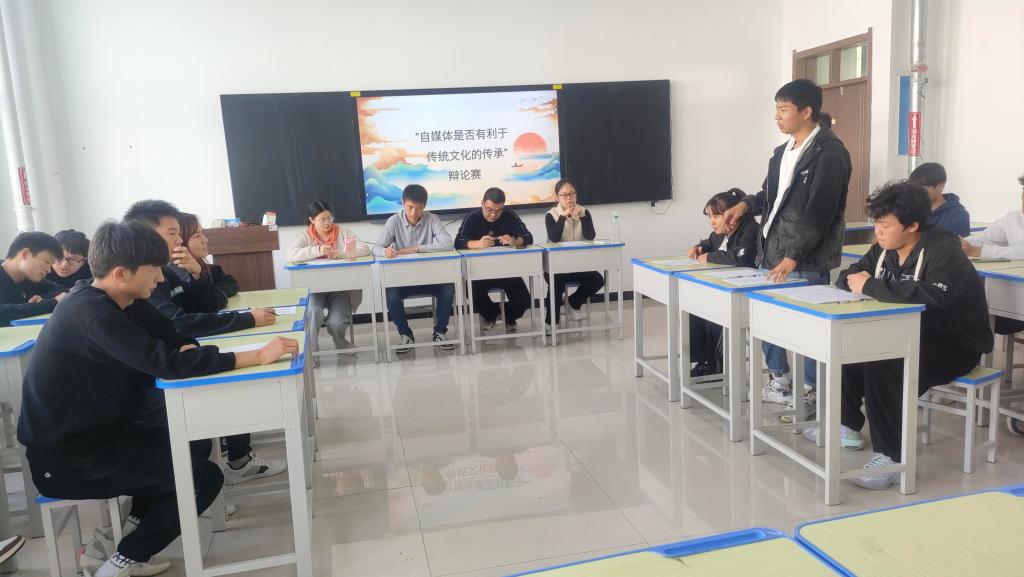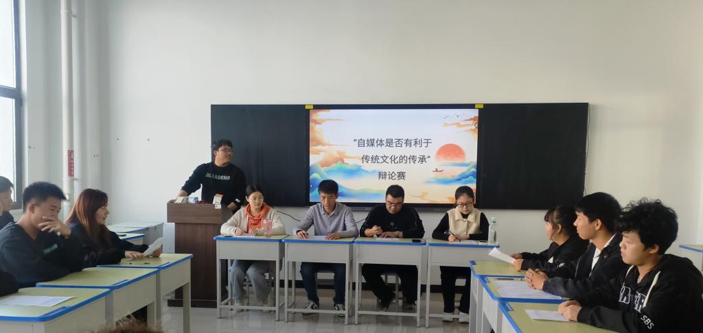 活动伊始,主持人向参赛选手介绍了系部的评委老师、比赛规则和各个环节。紧接着就进入到了如火如荼的辩论比赛当中。参加本次比赛的两支队伍围绕“自媒体是否有利于传统文化的传承”这一辩题展开论辩,为大家献上了一场头脑风暴和思维的饕餮盛宴。在辩论过程中,正反双方各持己见,正方始终坚持自己的观点:“自媒体是有利于传统文化的传承的,自媒体不仅给了大众接触更多传统文化的机会,使传统文化能够得到广泛传播,从而得到更多人的喜爱”;反方则认为:“自媒体向大众展示的传统文化的内容主观性较强,客观性略有不足,并且大众接收到的传统文化内容会受个人偏好影响,流量推送也会影响信息接收,因此我方坚持认为自媒体对于传统文化的传承弊大于利……”学生们通过说理、论证、质询种种方式证明自己的立场,展现出新时代新青年的风采。