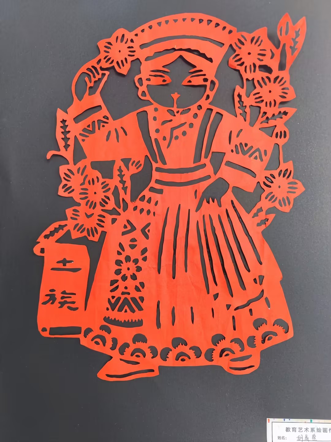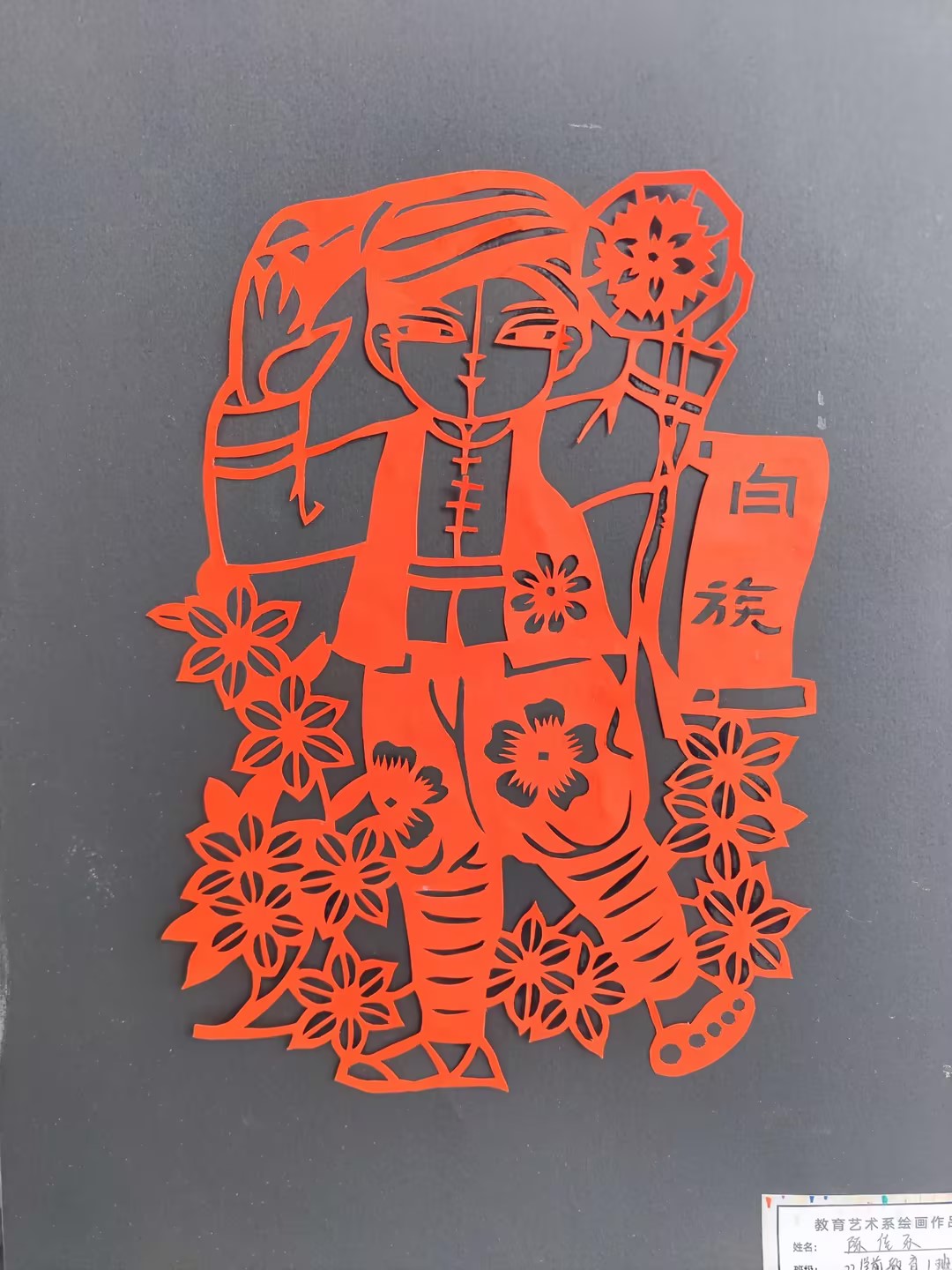 本次美术展由该系美术教研组教师和22级学前教育专业学生共同选题、设计、布展,参展作品种类涉及绘画、剪纸、手工等。其中剪纸作品以56个民族为主题,刻画56个民族人物形象,主题鲜明,一刻一画尽显中华传统艺术的独特魅力。简笔画作品呈现出各民族儿童在一起交流、交往、交融的画面。