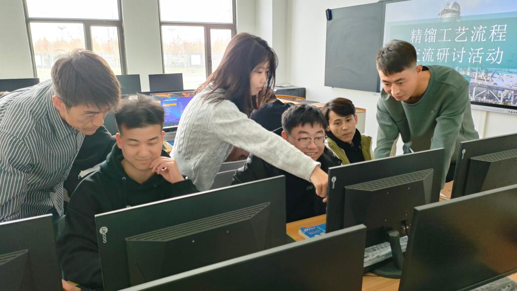 活动中,该系师生以丙烯酸甲酯的生产工艺流程,把酯化反应、丙烯酸分离回收、各工序的开停车操作等模块作为讨论题目。教师向学生分析了各个模块的操作注意事项,学生进行仿真操作。随后,师生根据精馏工艺的各个模块的疑难点展开一系列讨论。经过交流讨论,学生们将专业基础课的内容应用到了仿真系统工艺流程的实际操作中,熟悉了技能大赛的流程,也了解了将来工作岗位上的工作内容。