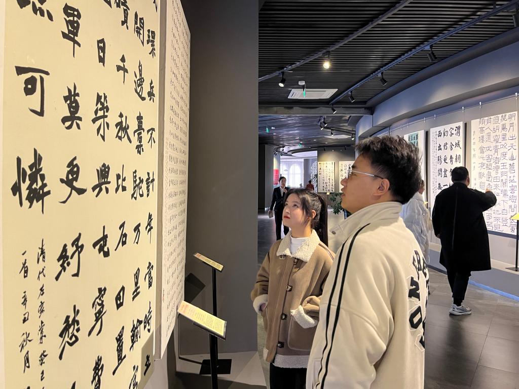 在自由参观时,教育艺术系教师倡议学生在欣赏书法的同时,可以对照作品前的“规范汉字”版本进行参观,学生们有的朗读诗句,有的阅读诗词释义和历史典故,感受国家通用语言文字的魅力和中华文化的博大精深。