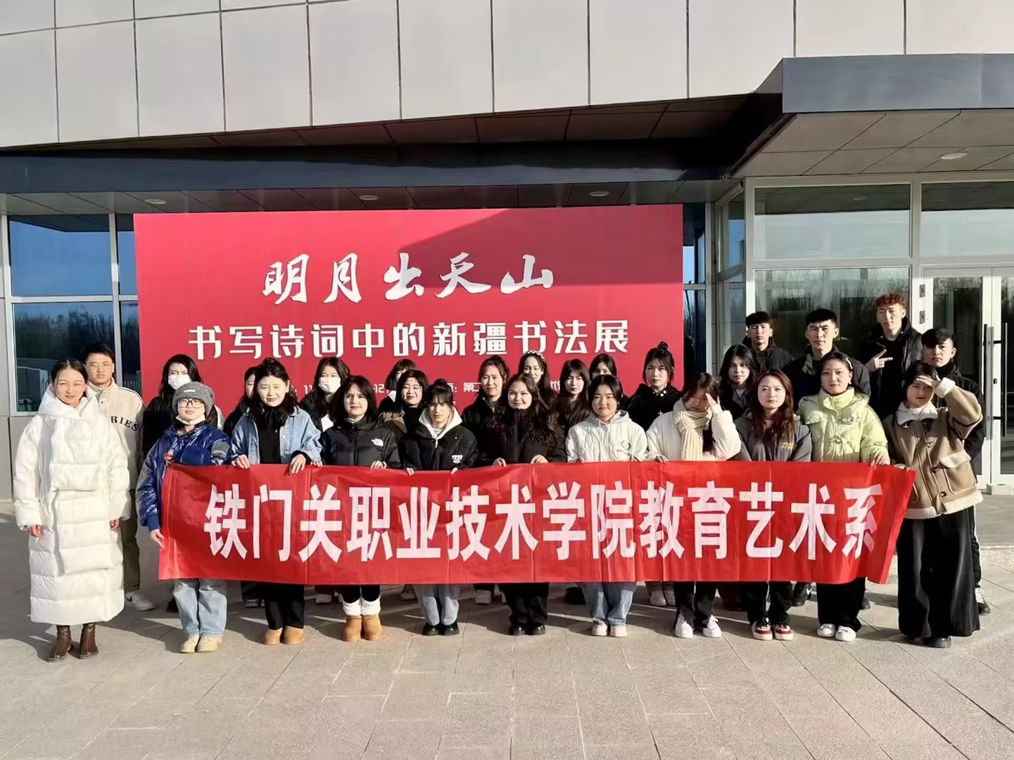 为深入学习贯彻习近平新时代中国特色社会主义思想主题教育,进一步铸牢中华民族共同体意识,宣传推广国家通用语言文字,12月5日上午,Beat365中文官方网站教育艺术系美术教研组教师带领22级学前教育专业8名共青团员和19名学生前往铁门关市美术馆参观“明月出天山”书写诗词中的新疆书法展。