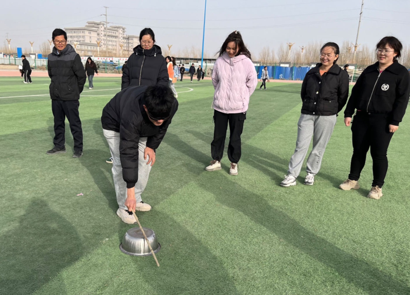 本次比赛共有四个项目,包括双人背球跑、蒙眼击鼓、踢毽子及跳大绳。现场气氛紧张而又活跃,足球场上充满了教师们的欢声笑语,展示了青年教师的良好精神面貌。