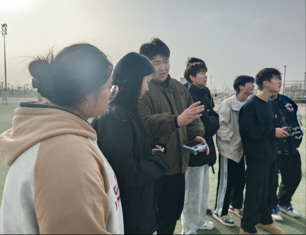 活动开始,指导老师先向同学们细心地讲解了无人机各个零部件的工作原理以及基本的使用常识和操作流程,随后参训人员在老师的指导下轮流进行无人机实际操作练习,完成调试、起飞、上升、俯仰、拍摄、返程等常用基本动作。活动中,大家热情高涨,专心致志,生怕错过每一项操作。