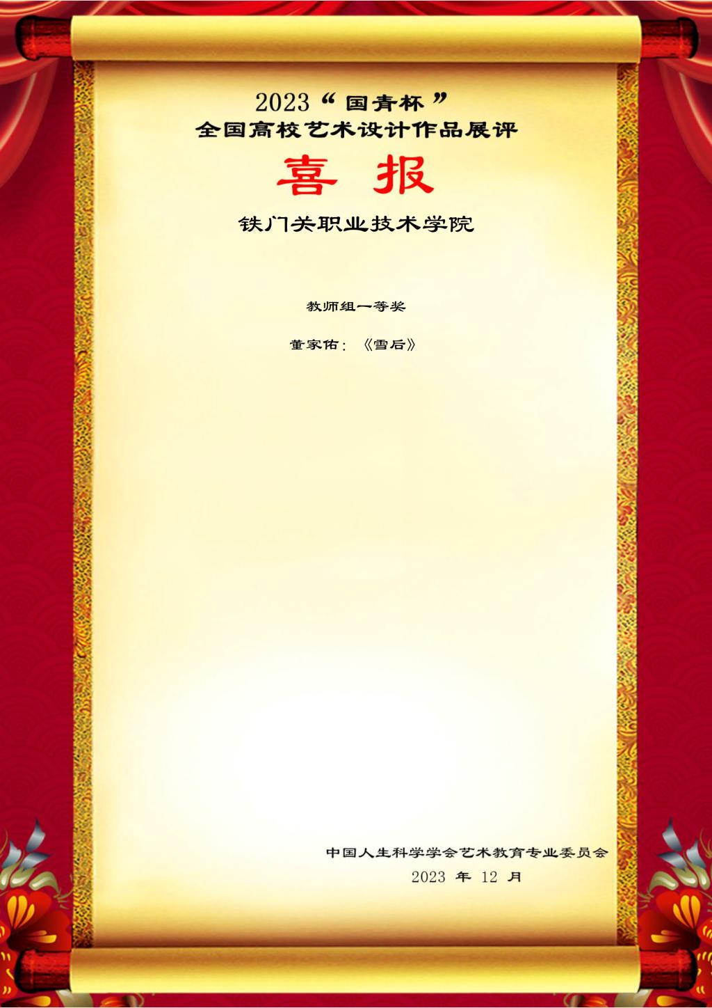 近日,由中国人生科学学会艺术教育专业委员会举办的国家级2023年“国青杯”高校艺术设计作品征集活动结果公布,Beat365中文官方网站教育艺术系教师董家佑美术作品获得教师组一等奖。该活动以“融合·创新”为主题,坚持思想精深、艺术精湛、制作精良相统一,紧扣时代脉搏,贴近现实生活,展现了鲜明的地域风格、深厚的文化意蕴和独特的审美价值。