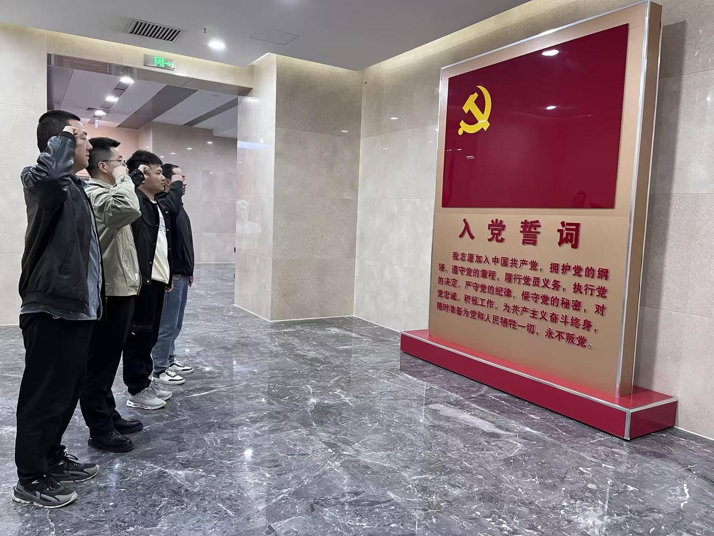 活动伊始,党支部书记带领全体党员,进行入党誓词的宣誓。高举右拳,面对党旗,庄严宣誓。铿锵有力的誓言表达出他们对革命先烈的敬仰之情以及坚定不移跟党走的决心。