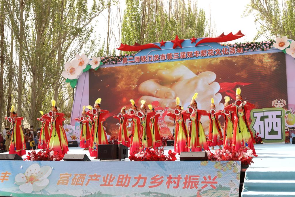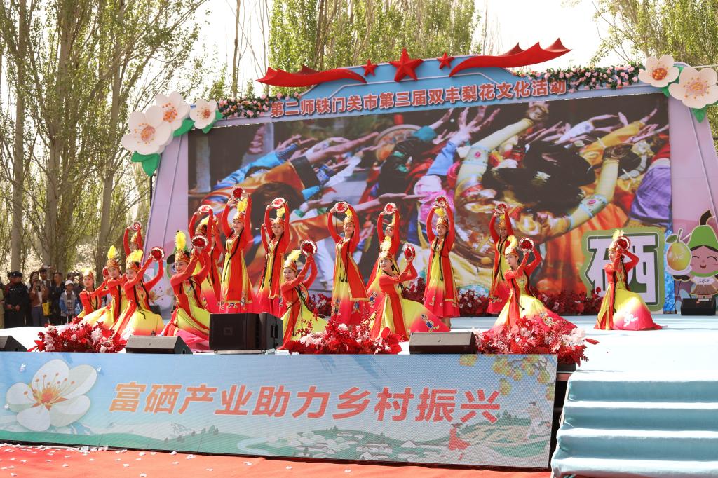 4月13日,第二师铁门关市第三届双丰梨花文化活动开幕式中,舞蹈团成员带来了维吾尔族舞蹈《石榴花开》,音乐响起,铃鼓声声宛若党的呼唤,声声铃鼓如同血液间的对话,舞蹈团成员用激昂的舞姿赞颂这美好的时代,描绘出了各民族间和谐、幸福生活的场景。