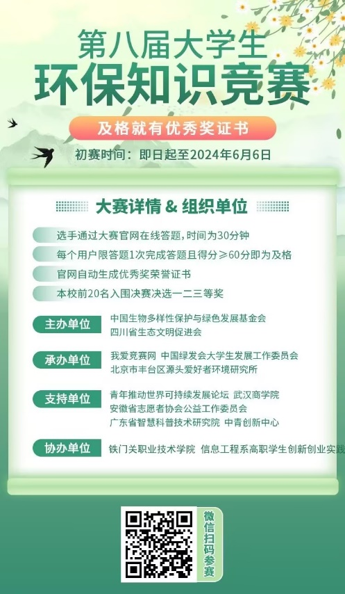 为提升大学生环保意识,展现当代青年的环保担当与青春风采,4月16日,铁门关职业技术信息工程系组织全系1300余名学生线上参与了中国生物多样性保护与绿色发展基金会、四川省生态文明促进会、我爱竞赛网共同举办的2024年第八届大学生环保知识竞赛。