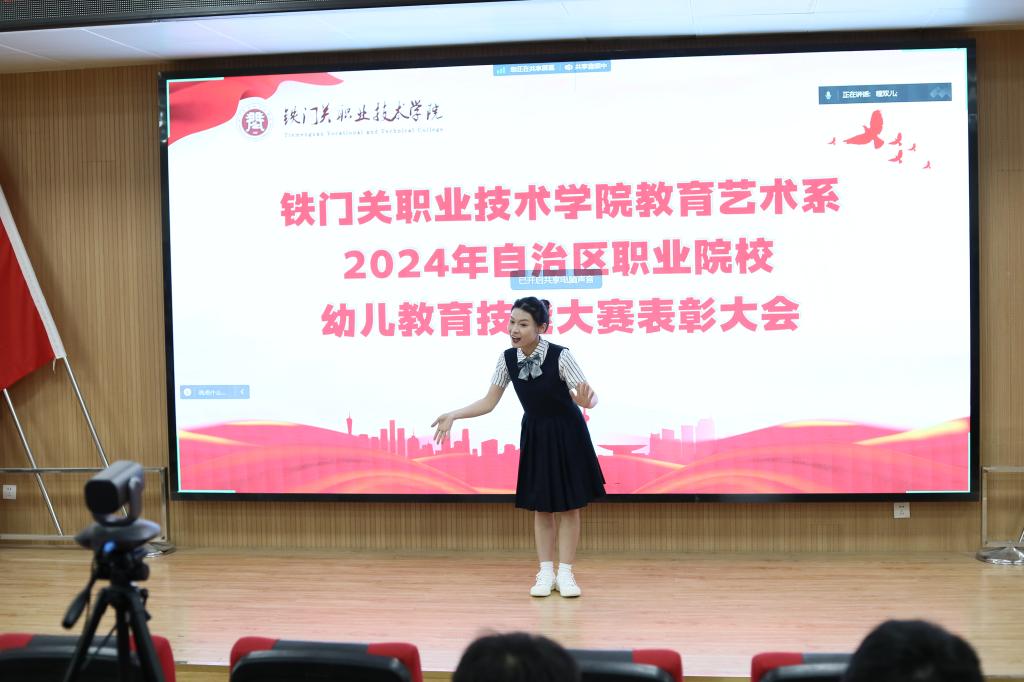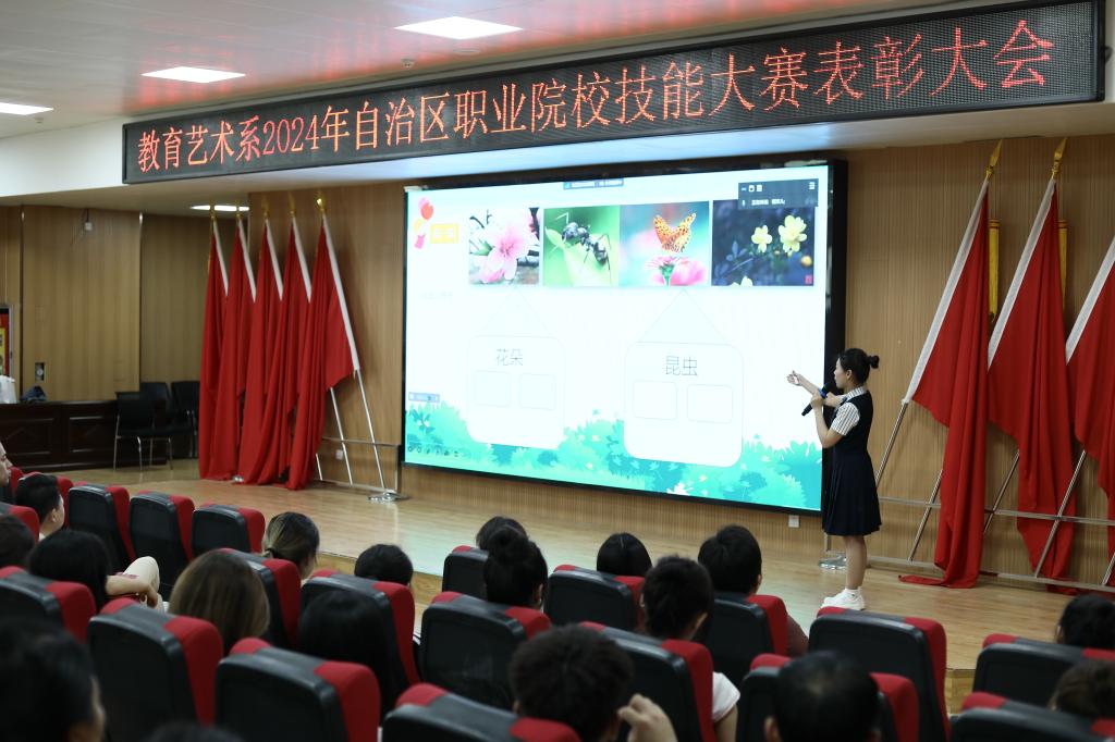 接着,获得2024年自治区职业院校幼儿教育技能大赛一等奖的两名学生,为在场师生展示了幼儿园教师综合技能测评中的模拟教学项目。通过展示,让现场未指导过技能大赛的教师和未参过赛的学生了解到,技能大赛并不是另一个全新的领域,各赛项是与实际课堂学习紧密相关的,是对平时所学习的所有知识技能进行融合、统筹的一种实践方式。