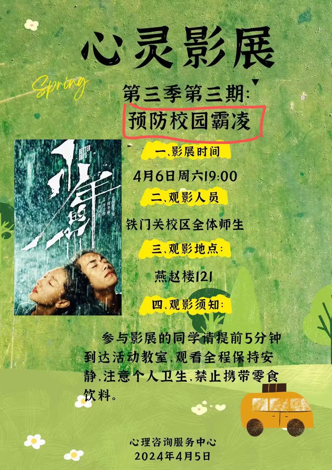 同时,为了让大家更深入地了解校园霸凌对受害者心理的影响,4月份心理教学部特别选取了与校园霸凌相关的电影《少年的你》、《悲伤逆流成河》等进行展映。我们希望通过这种方式,让更多的学生能够站在受害者的角度,理解他们的痛苦,进而激发对反校园霸凌的共鸣和行动。