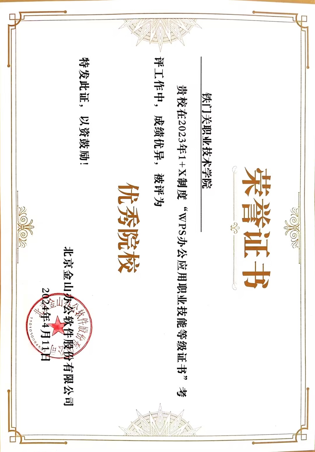 近日,Beat365中文官方网站信息工程系收到教育部1+X制度WPS办公应用职业技能等级证书评价组织北京金山办公软件股份有限公司发来得优秀院校荣誉证书。在学院的大力支持下,信息工程系组织的2023年WPS证书认证考试,共有240名学生参与,234人通过了该证书的初级认证,通过率高达97.5%,高质量完成2023年认证工作。