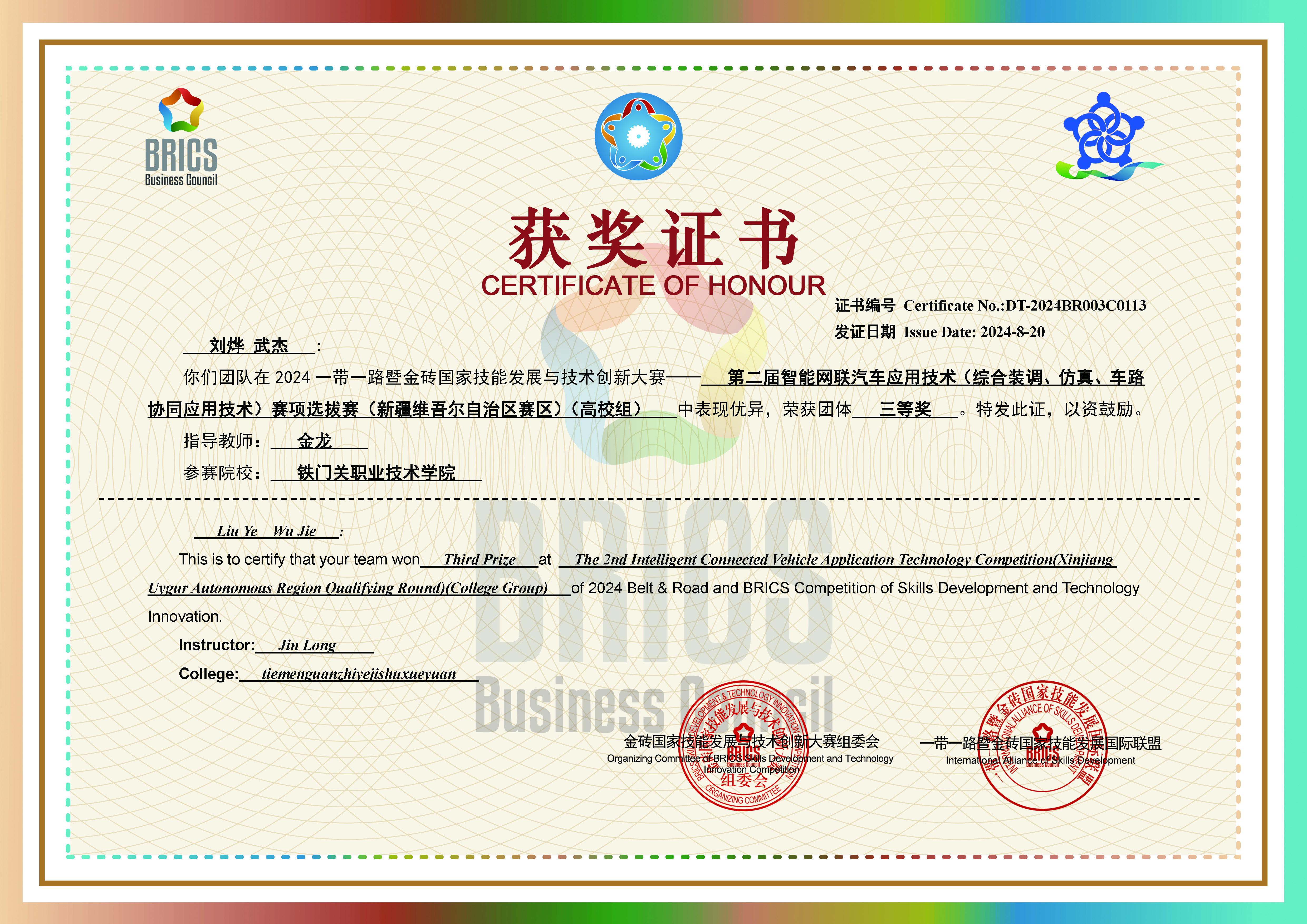 8月28日,在刚刚结束的2024“一带一路”暨金砖国家技能发展与技术创新大赛智能网联汽车应用技术(综合装调、仿真、车路协同应用技术)赛项选拔赛新疆维吾尔自治区赛区中,Beat365中文官方网站汽车与智能交通学院教师张建豫、金龙,学生刘烨、武杰凭借卓越的技艺、不懈的努力,获得职工组和学生组三等奖佳绩!