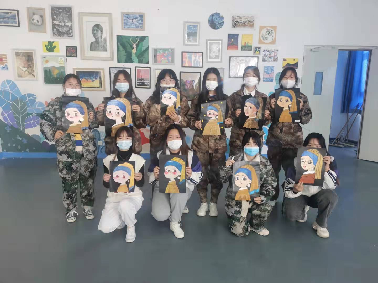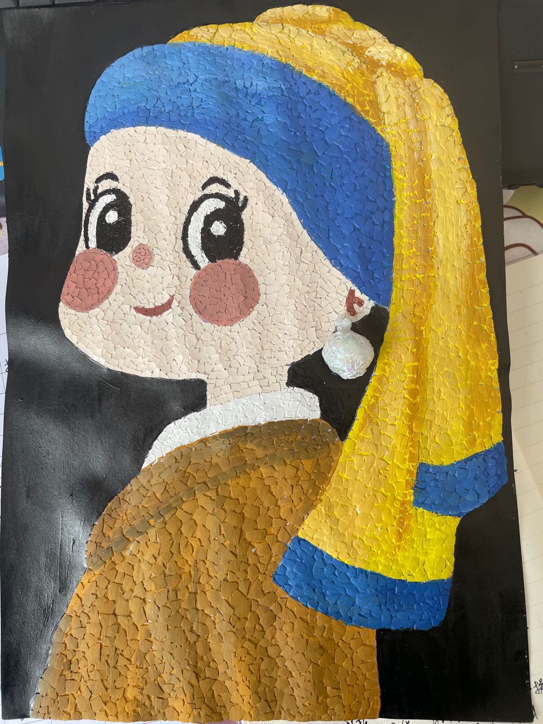 活动中,美术教师向学生展示了荷兰小画派大师维米尔的作品《戴珍珠耳环的少女》,并从作品的光线、色彩及艺术特点等方面进行了具体讲解,让学生对作品有了初步的了解和认识。在手工制作阶段,学生利用教师提供的教学用具,仔细将蛋壳粘贴在轮廓线内,并将颜料均匀涂抹在蛋壳上,废弃的蛋壳呈现出的特殊纹理使画面更加生动有趣。